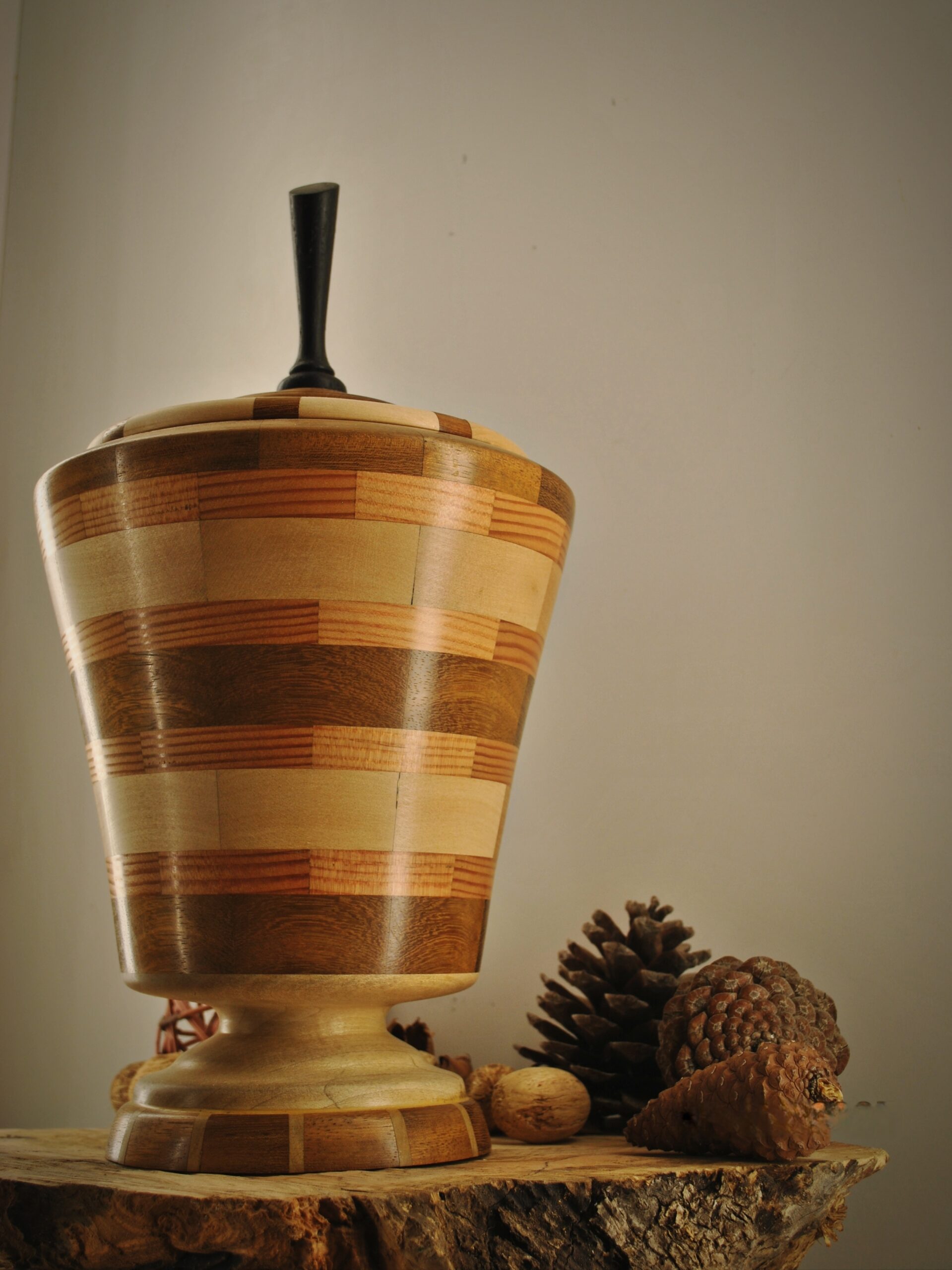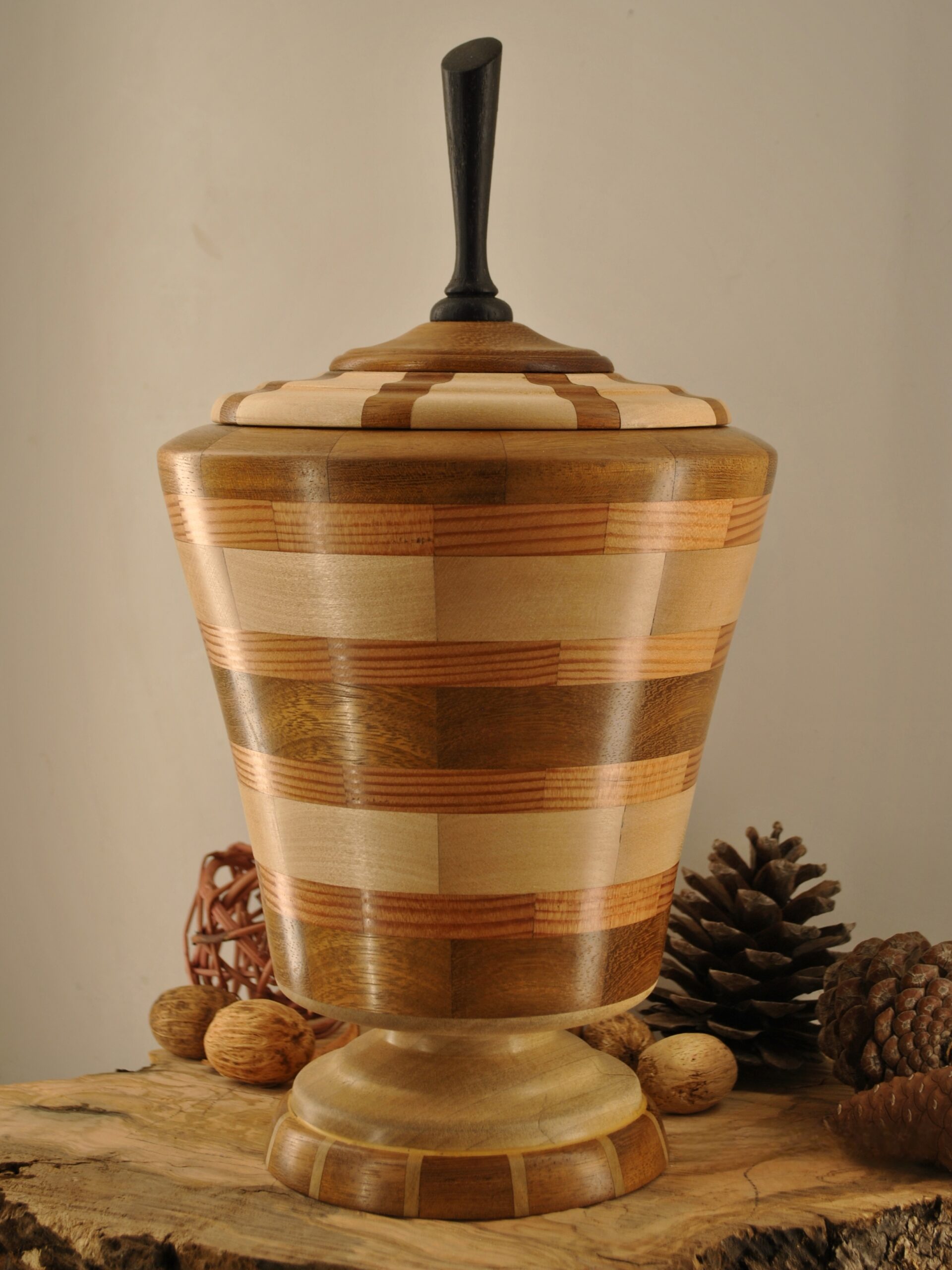 Βάζο με καπάκι με συνδυασμό τριών διαφορετικών ξύλων από iroco Oregon Poplar σε διαστάσεις 38cm ύψος και 22cm διάμετρος