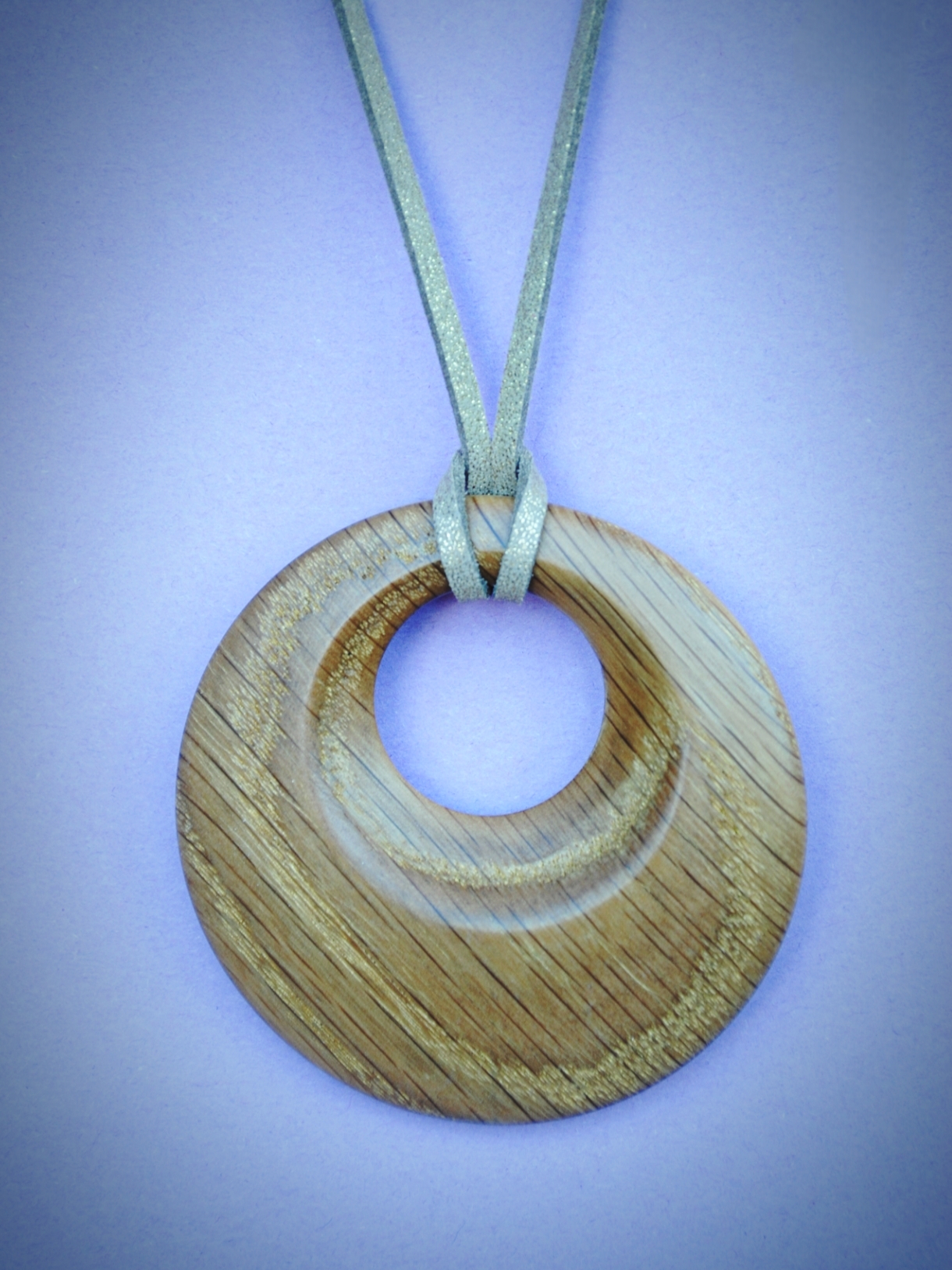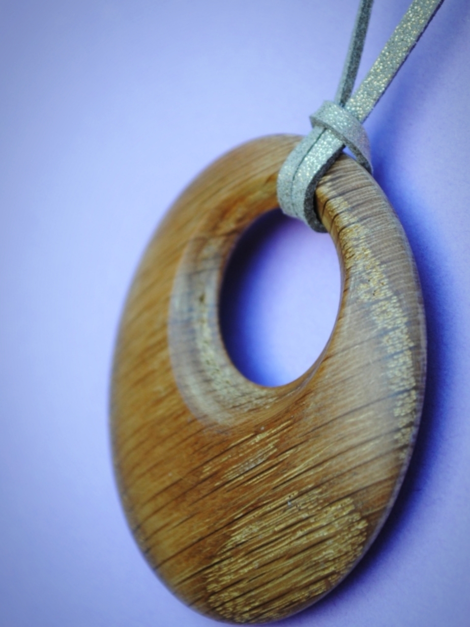 Κολιέ από ξύλο δρυς σε χρυσό απόχρωση στο ανάγλυφο του φινίρισμα με κεραλοιφη οικολογική με δερμάτινο κορδόνι suede σε διάμετρο 68 χιλιοστά