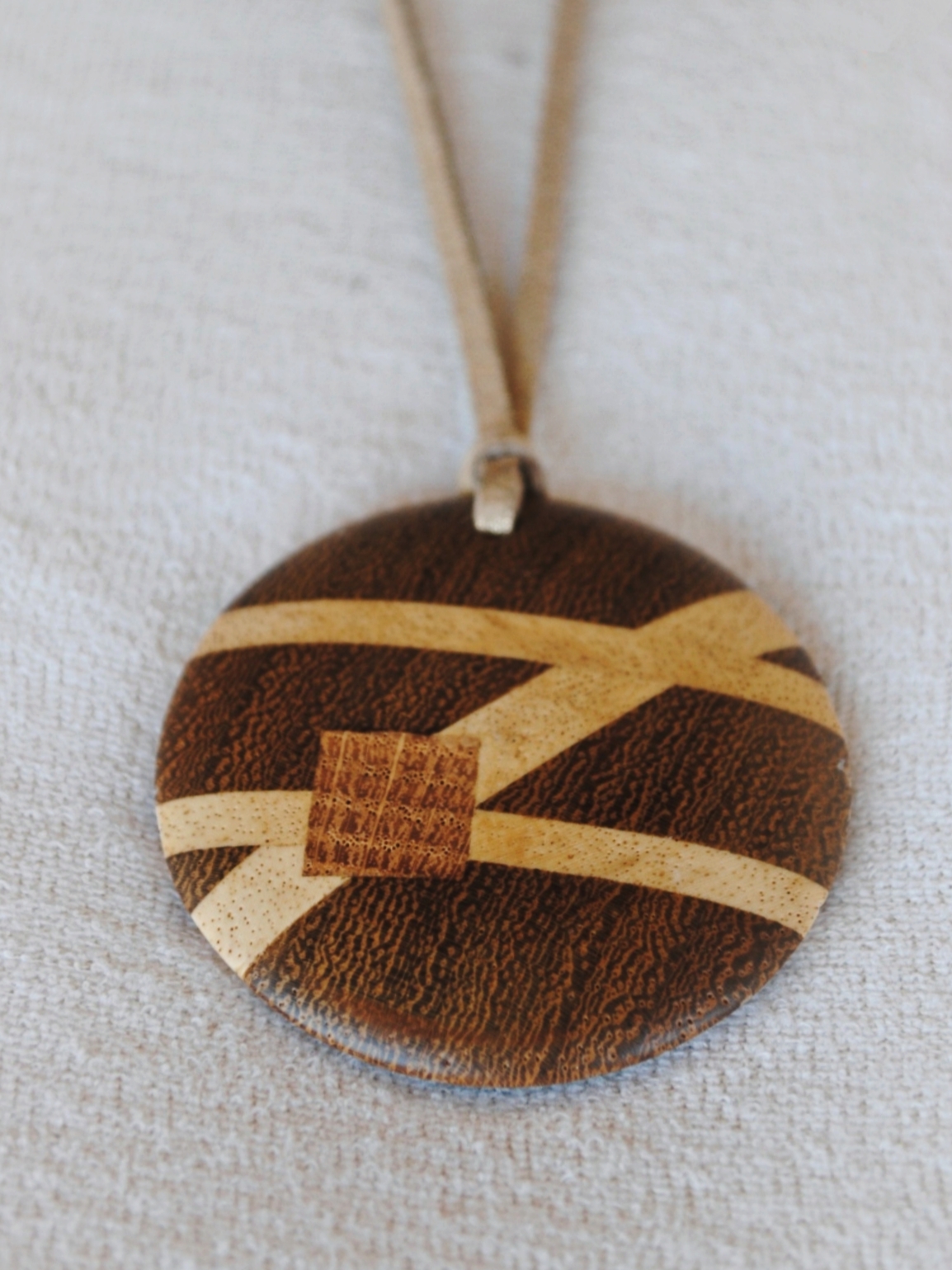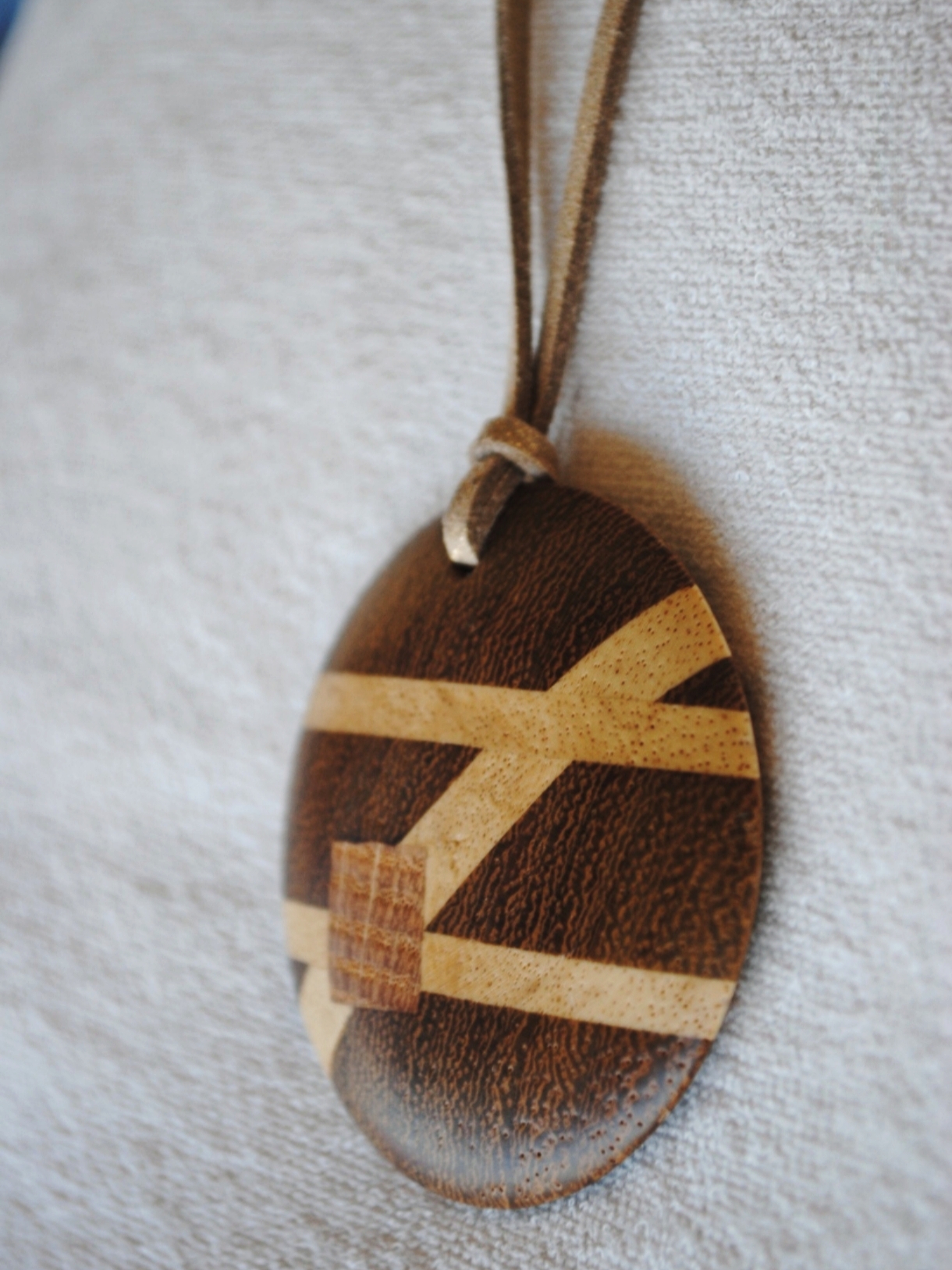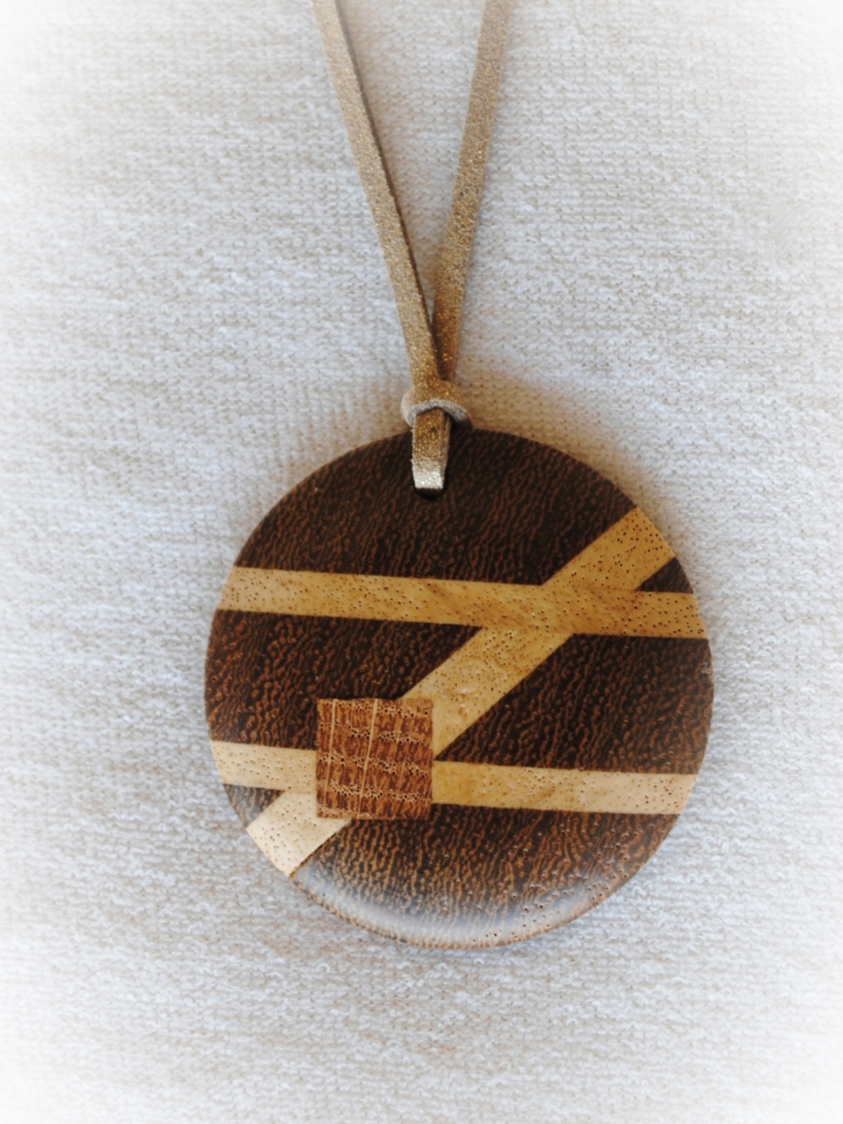 Κολιέ σε συνδυασμό τριών διαφορετικών ξύλων η βάση από iroco οι γραμμές από agios και το τετράγωνο στοιχείο από Δρυς φινίρισμα με κεραλοιφη οικολογική το κορδόνι είναι δερμάτινο καί η διάμετρος είναι 55 χιλιοστά